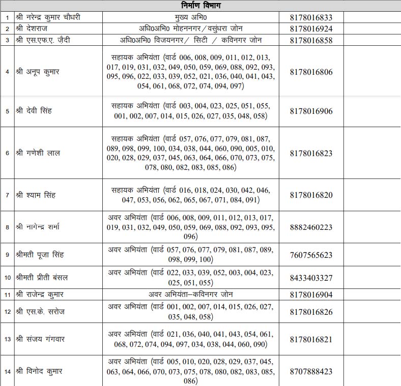 नगर निगम गाजियाबाद के निर्माण विभाग के अधिकारियों की जोनवार सूची।